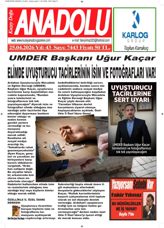 Ardahan Uyuşturucuyla Mücadele ve Eğitim Derneği (UMDER) Başkanı Uğur Kaçar, uyuşturucu tacirlerine karşı başlattıkları mücadele kapsamında, “Bundan sonra isimlerinizi ve fotoğraflarınızı tek tek yayınlayacağım” diyerek isim ve fotoğrafları elinde olduğunu öne sürdüğü zehir tacirlerini ifşa edeceğini duyurması bunların kimler olduğu ve neden hemen gerekli yerlere vermediği ve kamuoyuna duyurulmadığı merak edildi.