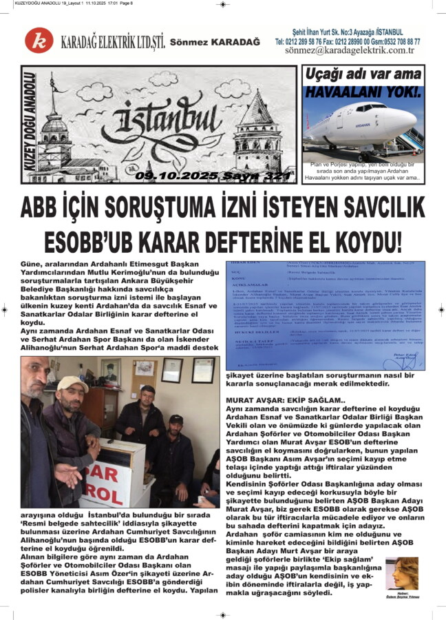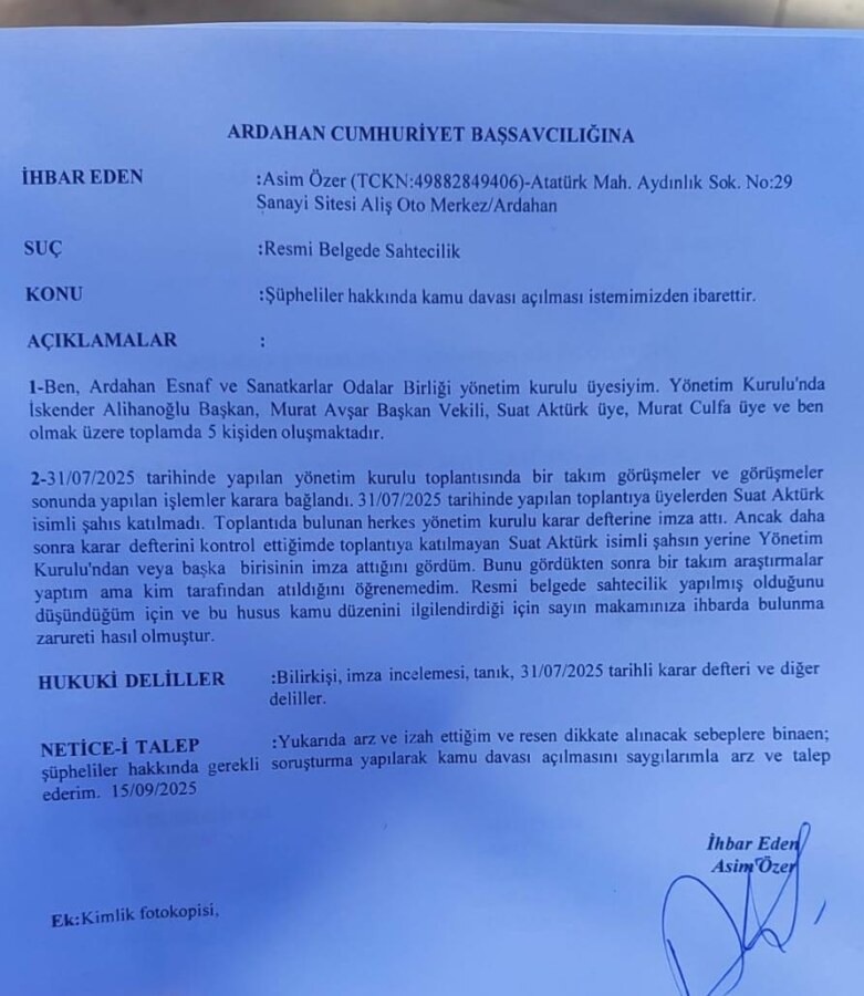 Aynı zamanda Ardahan Esnaf ve Sanatkarlar Odası ve Serhat Ardahan Spor Başkanı da olan İskender Alihanoğlu‘nun Serhat Ardahan Spor‘a maddi destek arayışına olduğu İstanbul’da bulunduğu bir sırada ‘Resmi belgede sahtecilik’ iddiasıyla şikayette bulunması üzerine Ardahan Cumhuriyet Savcılığının Alihanoğlu’nun başında olduğu ESOBB’un karar defterine el koyduğu öğrenildi.
