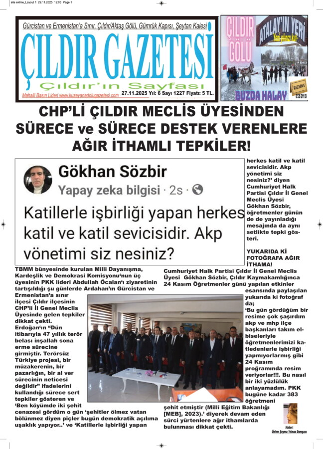 TBMM bünyesinde kurulan Milli Dayanışma, Kardeşlik ve Demokrasi Komisyonu‘nun üç üyesinin PKK lideri Abdullah Öcalan‘ı ziyaretinin tartışıldığı şu günlerde Ardahan’ın Gürcistan ve Ermenistan’a sınır ilçesi Çıldır ilçesinin CHP’li İl Genel Meclis Üyesinde gelen tepkiler dikkat çekti.