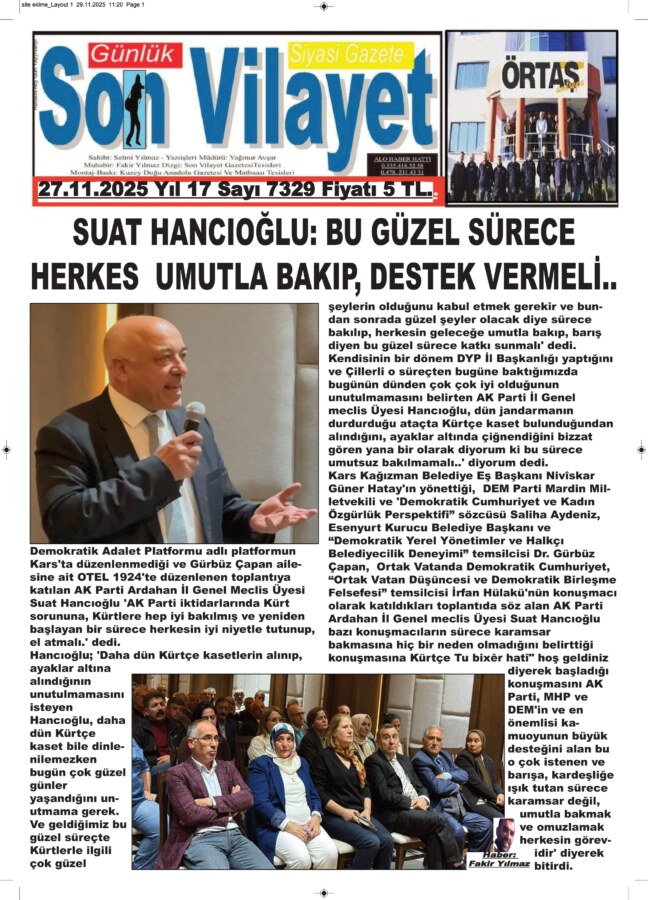 Demokratik Adalet Platformu adlı platformun Kars’ta düzenlenmediği ve Gürbüz Çapan ailesine ait OTEL 1924’te düzenlenen toplantıya katılan AK Parti Ardahan İl Genel Meclis Üyesi Suat Hancıoğlu ‘AK Parti iktidarlarında Kürt sorununa, Kürtlere hep iyi bakılmış ve yeniden başlayan bir sürece herkesin iyi niyetle tutunup, el atmalı.’ dedi.
