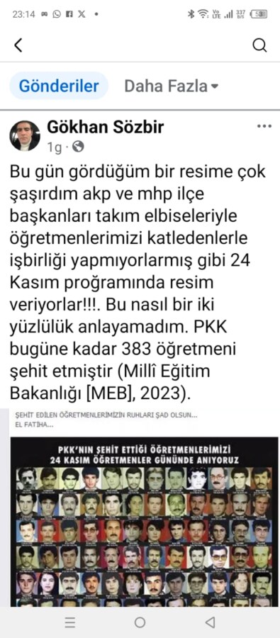 ‘Bu gün gördüğüm bir resime çok şaşırdım akp ve mhp ilçe başkanları takım elbiseleriyle öğretmenlerimizi katledenlerle işbirliği yapmıyorlarmış gibi 24 Kasım programında resim veriyorlar!!!. Bu nasıl bir iki yüzlülük anlayamadım. PKK bugüne kadar 383 öğretmeni şehit etmiştir (Millî Eğitim Bakanlığı [MEB], 2023).’ diyerek devam eden süreci yürütenlere ağır ithamlarda bulunması dikkat çekti.