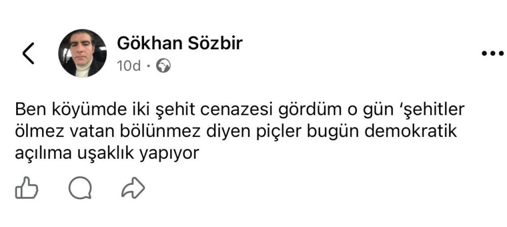 Erdoğan‘ın “Dün itibarıyla 47 yıllık terör belası inşallah sona erme sürecine girmiştir. Terörsüz Türkiye projesi, bir müzakerenin, bir pazarlığın, bir al ver sürecinin neticesi değildir” ifadelerini kullandığı sürece sert tepkiler gösteren ve ‘Ben köyümde iki şehit cenazesi gördüm o gün ‘şehitler ölmez vatan bölünmez diyen piçler bugün demokratik açılıma uşaklık yapıyor..’ ve ‘Katillerle işbirliği yapan herkes katil ve katil sevicisidir. Akp yönetimi siz nesiniz?’ diyen Cumhuriyet Halk Partisi Çıldır İl Genel Meclis Üyesi Gökhan Sözbir, öğretmenler günün de de yayınladığı mesajında da aynı setlikte tepki gösteri.
