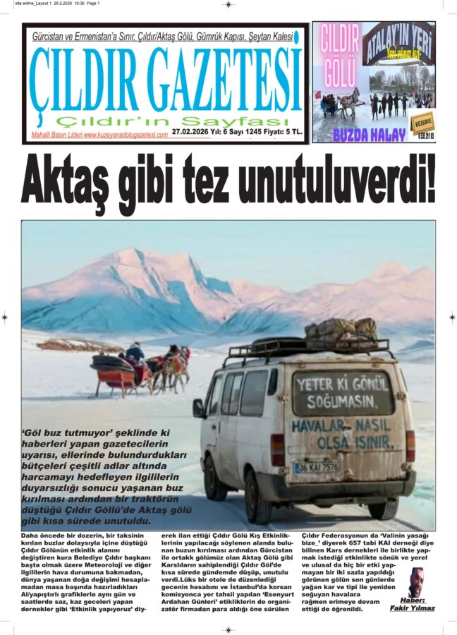 Daha öncede bir dozerin, bir taksinin kırılan buzlar dolaysıyla içine düştüğü Çıldır Gölünün etkinlik alanını değiştiren kura Belediye Çıldır başkanı başta olmak üzere Meteoroloji ve diğer ilgililerin hava durumuna bakmadan, dünya yaşanan doğa değişimi hesaplamadan masa başında hazırladıkları Al/yapıştırlı grafiklerle aynı gün ve saatlerde saz, kaz geceleri yapan dernekler gibi ‘Etkinlik yapıyoruz’ diyerek ilan ettiği Çıldır Gölü Kış Etkinliklerinin yapılacağı söylenen alanda bulunan buzun kırılması ardından Gürcistan ile ortakk gölümüz olan Aktaş Gölü gibi Karslıların sahiplendiği Çıldır Göl’de kısa sürede gündemde düşüp, unutulu verdi.