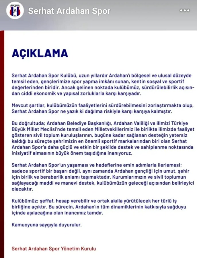 “Faruk Demir nerede? İş insanlarımız nerede? STK başkanlarımız nerede? Bu ilin milletvekilleri nerede? Serhat Ardahanspor sadece bir kulüp değil, bu şehrin kimliğidir. Bu büyük sorumluluğu sadece Abdullah Çekim ve bir avuç yöneticinin omuzlarına bırakmak, Ardahan’a ihanettir” denildi.
