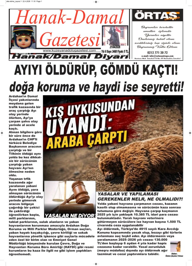 Alınan bilgilere göre bir süre önce de Ardahan’ın CHP’li türkücü Belediye Başkanının aracının çarptığı ve bir Tilkinin öldüğü aynı yolda bu kez dikkatsiz bir sürücünün çarptığı yaban hayvanı Ayı’nın ölmesine neden oldu.