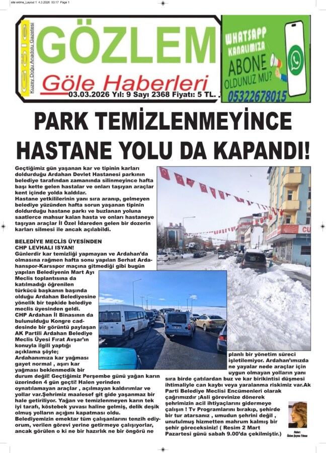 Belediyemizin emektar tüm çalışanlarını tenzih ediyorum, verilen görevi yerine getirmeye çalışıyorlar, ancak görülen o ki ne bir hazırlık ne bir öngörü ne planlı bir yönetim süreci işletilemiyor. Ardahan’ımızda ne yayalar nede araçlar için uygun olmayan yolların yanı sıra birde çatılardan buz ve kar birikintisi düşmesi ihtimaliyle can kaybı veya yaralanma riskimiz var.Ak Parti Belediye Meclisi Encümenleri olarak çağrımızdır ;Asli görevinize dönerek şehrimizin acil ihtiyaçlarını gidermeye çalışın ! Tv Programlarını bırakıp, şehirde bir tur atarsanız , umudun şehrini değil , unutulmuş hizmetten mahrum kalmış bir şehir göreceksiniz! ( Resim 2 Mart Pazartesi günü sabah 9.00’da çekilmiştir.)