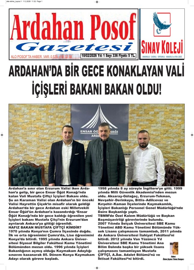 Ardahan’a sınır olan Erzurum Valisi iken Ardahan’a gelip, bir gece Ensar Öğüt Konağı’nda kalan Vali Mustafa Çiftçi İçişleri Bakanı oldu.