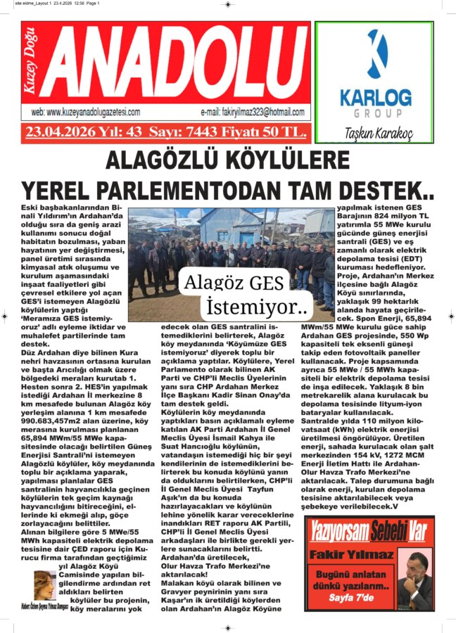 Eski başbakanlarından Binali Yıldırım’ın Ardahan’da olduğu sıra da geniş arazi kullanımı sonucu doğal habitatın bozulması, yaban hayatının yer değiştirmesi, panel üretimi sırasında kimyasal atık oluşumu ve kurulum aşamasındaki inşaat faaliyetleri gibi çevresel etkilere yol açan GES’i istemeyen Alagözlü köylülerin yaptığı ‘Meramıza GES istemiyoruz’ adlı eyleme iktidar ve muhalefet partilerinde tam destek.