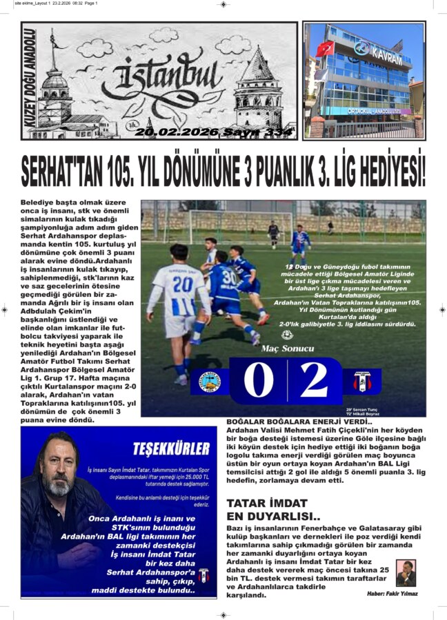 12 Doğu ve Güneydoğu fubol takımının mücadele ettiği Bölgesel Amatör Liginde bir üst lige çıkma mücadelesi veren ve Ardahan’ı 3 lige taşımayı hedefleyen Serhat Ardahanspor, Ardahan’ın Vatan Topraklarına katılışının105. Yıl Dönümünün kutlandığı gün Kurtalan’da aldığı 2-0’lık galibiyetle 3. lig iddiasını sürdürdü.