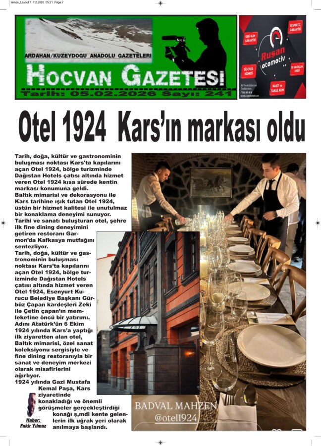 Tarih, doğa, kültür ve gastronominin buluşması noktası Kars’ta kapılarını açan Otel 1924, bölge turizminde Dağıstan Hotels çatısı altında hizmet veren Otel 1924, Esenyurt Kurucu Belediye Başkanı Gürbüz Çapan kardeşleri Zeki ile Çetin çapan’ın memleketine öncü bir yatırımı.
