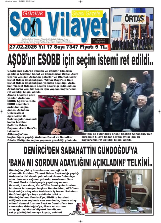 Alınan bilgilere göre yapılan Ardahan ESOB; AŞOB ve Göle ESOB seçimleri ardından seçim öncesi Ardahan Üniversitesi öğrencileri ile Dolmuşçular arasında kalan Ardahan Şoförler Odası Başkanı Asım Özer’in, İskender Alihanoğlu’nun başkanlığını yaptığı Ardahan Esnaf ve Sanatkar Odalar Birliğinin seçim yapması gerektiği yönünde istem de bulunduğu ancak başkan Alihanoğlu’nun süresinin 5. aya kadar devam ettiği için bu başvurunun ret edildiği bilgisi alındı.