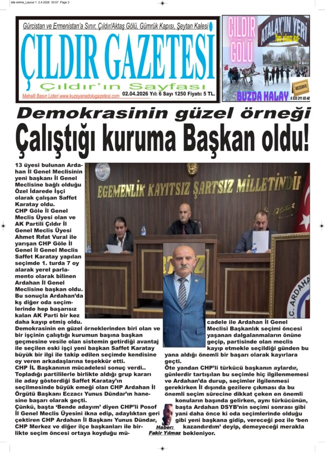 AK PARTİ ORAYIDA ALAMADI!.. CHP Göle İl Genel Meclis Üyesi olan ve AK Partili Çıldır İl Genel Meclis Üyesi Ahmet Rıfat Vural ile yarışan Karatay yapılan seçimde 1. turda 7 oy alarak yerel parlamento olarak bilinen Ardahan İl Genel Meclisine başkan oldu. Bu sonuçla Ardahan’da kş diğer oda seçimlerinde hep başarısız kalan AK Parti bir kez daha kayıp etmiş oldu.