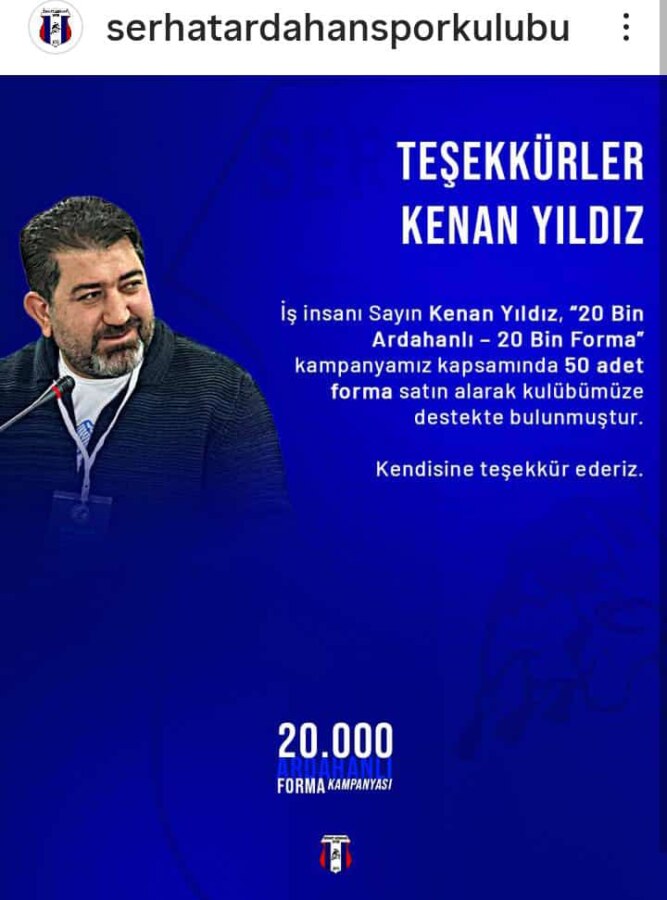 Takımın başlattığı ‘Bir formada sen al’ kampanyasına 50 forma alarak destek veren ATSO Başkan Adayı Kenan Yıldız’da Vali Mehmet Fatih Çiçekli gibi tüm Ardahanlıları Serhat Ardahanspor’a sahip çıkmaya davet etti.