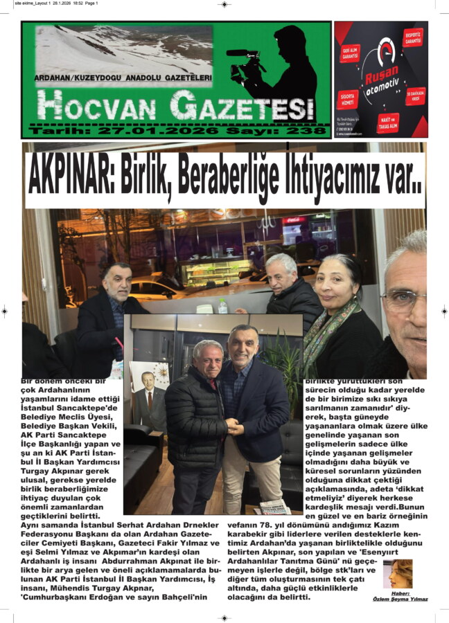 Aynı samanda İstanbul Serhat Ardahan Drnekler Federasyonu Başkanı da olan Ardahan Gazeteciler Cemiyeti Başkanı, Gazeteci Fakir Yılmaz ve eşi Selmi Yılmaz ve Akpımar’ın kardeşi olan Ardahanlı iş insanı Abdurrahman Akpınat ile birlikte bir arya gelen ve öneli açıklamamalarda bulunan AK Parti İstanbul İl Başkan Yardımcısı, İş insanı, Mühendis Turgay Akpnar, ‘Cumhurbaşkanı Erdoğan ve sayın Bahçeli’nin birlikte yürüttükleri son sürecin olduğu kadar yerelde de bir birimize sıkı sıkıya sarılmanın zamanıdır’ diyerek, başta güneyde yaşananlara olmak üzere ülke genelinde yaşanan son gelişmelerin sadece ülke içinde yaşanan gelişmeler olmadığını daha büyük ve küresel sorunların yüzünden olduğuna dikkat çektiği açıklamasında, adeta ‘dikkat etmeliyiz’ diyerek herkese kardeşlik mesajı verdi.
