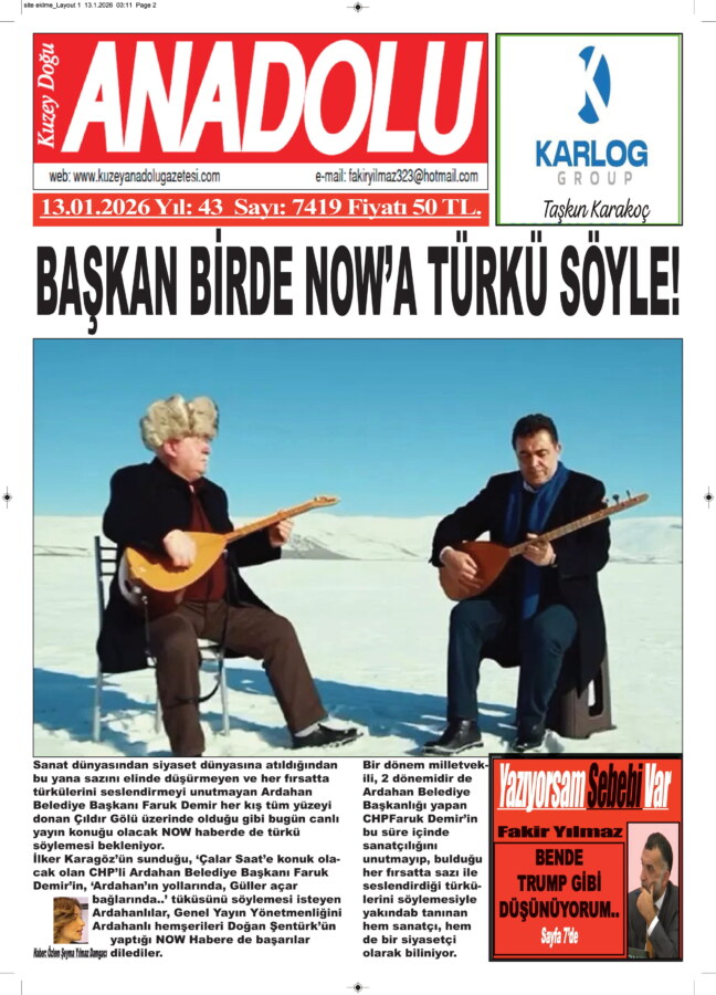 Sanat dünyasından siyaset dünyasına atıldığından bu yana sazını elinde düşürmeyen ve her fırsatta türkülerini seslendirmeyi unutmayan Ardahan Belediye Başkanı Faruk Demir her kış tüm yüzeyi donan Çıldır Gölü üzerinde olduğu gibi bugün canlı yayın konuğu olacak NOW haberde de türkü söylemesi bekleniyor.