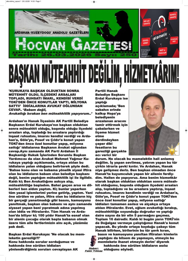 Ardahan’ın Hanak İlçesinin AK Partili Belediye Başkanın Erdal Kurukaya’nın başkan olduktan sonra müteahhit olduğu, başında olduğu ilçedeki arsaları alıp, topladığı bu arsalara yaptırdığı inşaat ruhsatını, imarını kendisi verdiği ve Ardahan’a, Göle’ye, Posof ve Çıldır’a konut yapan TOKİ’den önce özel konutlar yapıp, milyona sattığı’ iddialarına Başkanın Avukat oğlundan cevap.