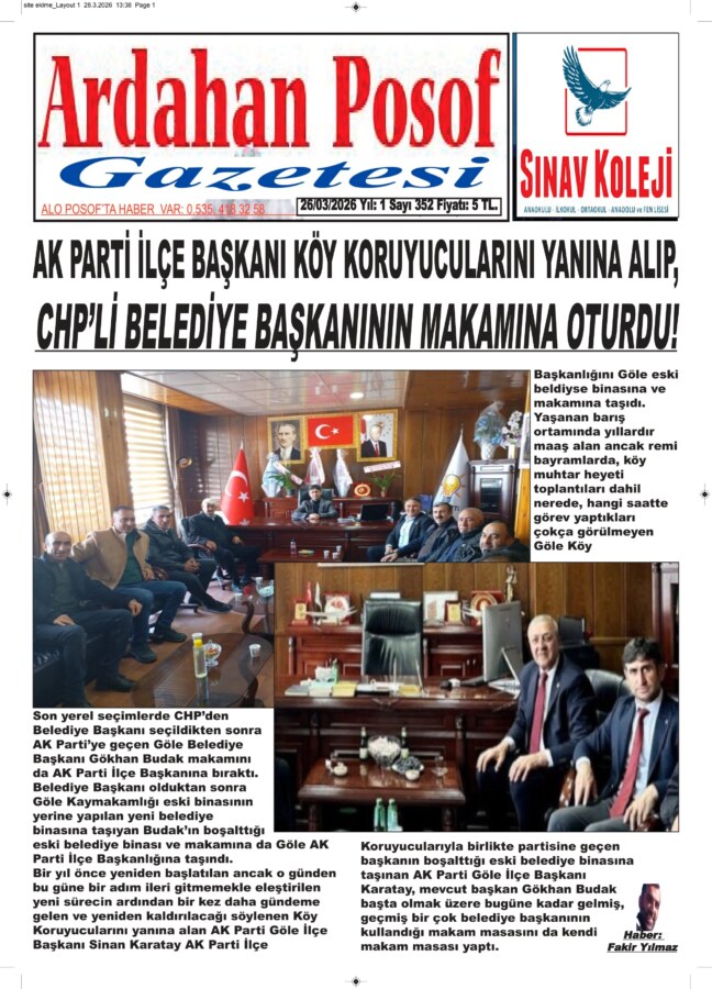 Yaşanan barış ortamında yıllardır maaş alan ancak remi bayramlarda, köy muhtar heyeti toplantıları dahil nerede, hangi saatte görev yaptıkları çokça görülmeyen Göle Köy Koruyucularıyla birlikte partisine geçen başkanın boşalttığı eski belediye binasına taşınan AK Parti Göle İlçe Başkanı Karatay, mevcut başkan Gökhan Budak başta olmak üzere bugüne kadar gelmiş, geçmiş bir çok belediye başkanının kullandığı makam masasını da kendi makam masası yaptı.