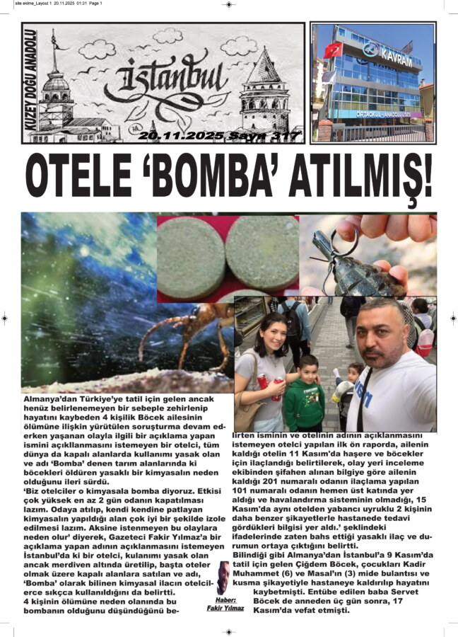 Almanya’dan Türkiye’ye tatil için gelen ancak henüz belirlenemeyen bir sebeple zehirlenip hayatını kaybeden 4 kişilik Böcek ailesinin ölümüne ilişkin yürütülen soruşturma devam ederken yaşanan olayla ilgili bir açıklama yapan ismini açıklanmasını istemeyen bir otelci, tüm dünya da kapalı alanlarda kullanımı yasak olan ve adı ‘Bomba’ denen tarım alanlarında ki böcekleri öldüren yasaklı bir kimyasalın neden olduğunu ileri sürdü.