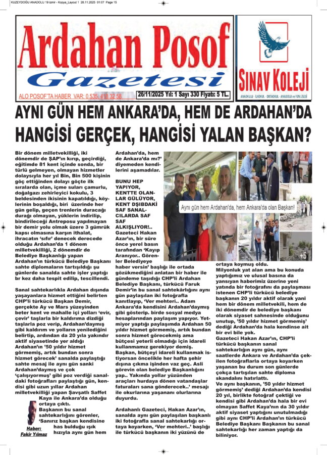 Aynı zaman da Ardahan Gazeteciler Cemiyeti, ARSİAD ve SARDAFED’in Başkanı olan Gazeteci Fakir Yılmaz bugün ele aldığı yazısında ağır yolsuzluk, usulsüzlük iddialarla suçladığı CHP’li Türkücü Belediye Başkanı hakkında Ardahan Cumhuriyet Başsavcılığına şikayet başlığı ile ihbar mesajına yazdı.