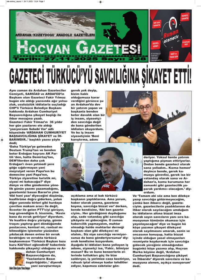 Gazeteci Fakir Yılmaz’ın 36 yıldır her gün yazılarını ele aldığı ‘Yazıyorsam Sebebi Var’ adlı köşesinde ‘ARDAHAN CUMHURİYET BAŞSAVCILIĞINA ŞİKAYET ve İHBARIMDIR..’ başlıklı yazısı şöyle dedi;