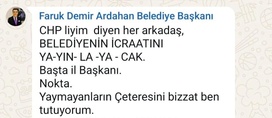 Türkücü CHP’li Ardahan Belediye Başkanı bir çok parti İl ve İlçe Örgüt yöneticilerinin bulunduğu whatsapp grubunda gece yarısı yazdığı mesajlar parti örgütlerinde şok etkisi yaptı.