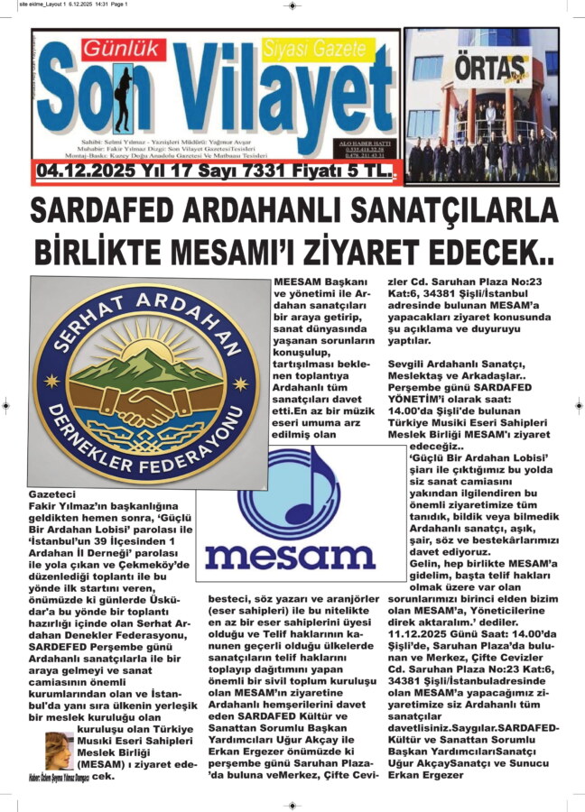 En az bir müzik eseri umuma arz edilmiş olan besteci, söz yazarı ve aranjörler (eser sahipleri) ile bu nitelikte en az bir eser sahiplerini üyesi olduğu ve Telif haklarının kanunen geçerli olduğu ülkelerde sanatçıların telif haklarını toplayıp dağıtımını yapan önemli bir sivil toplum kuruluşu olan MESAM’ın ziyaretine Ardahanlı hemşerilerini davet eden SARDAFED Kültür ve Sanattan Sorumlu Başkan Yardımcıları Uğur Akçay ile Erkan Ergezer önümüzde ki perşembe günü Saruhan Plaza’da buluna ve