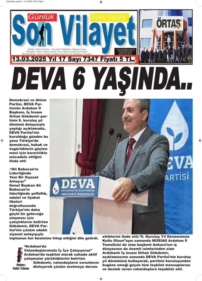 Demokrasi ve Atılım Partisi, DEVA Partisinin Ardahan İl Başkanı, İş İnsanı Orhan Gökdemir partinin 6. kuruluş yıl dönümü dolayısıyla yaptığı açıklamada, DEVA Partisi’nin kurulduğu günden bu yana Türkiye’de demokrasi, hukuk ve özgürlüklerin güçlenmesi için kararlılıkla mücadele ettiğini ifade etti.