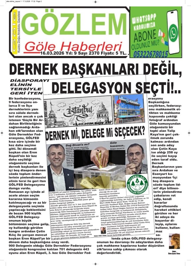 Ramazan ayı içinde al acele alınan seçim kararına kimsenin katılmayacağı ve az bir delegasyonla seçimin yapılacağı beklentisini de bozan 900 kişilik GÖL/FED Delegasyonunun büyük bölümünün seçime gelip, oy kullandığı görülen kongre ardından Çetin Kılıç ile yarışan mevcut başkan Eren Küpeli’ye bir dönem daha başkanlığına onay verdi.