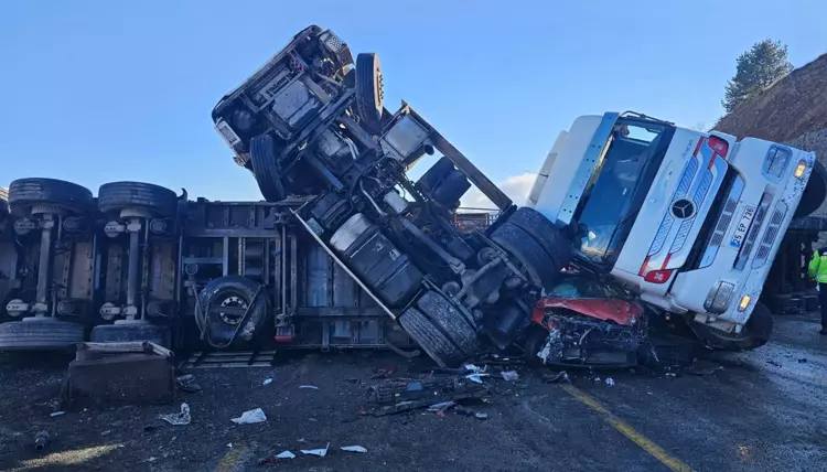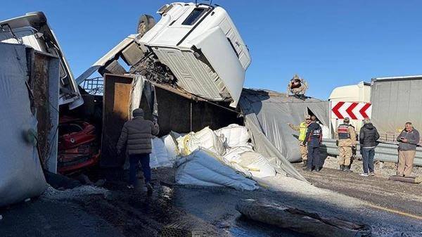AFAD ekibi, 2 TIR’ın arasında kalıp hurdaya dönen otomobilin sürücüsünü çıkararak sağlık ekiplerine teslim etti. İlk müdahalesi yapılan sürücü hastaneye kaldırıldı. Kaza sebebiyle kara yolunda ulaşım kontrollü olarak sürdürülüyor.