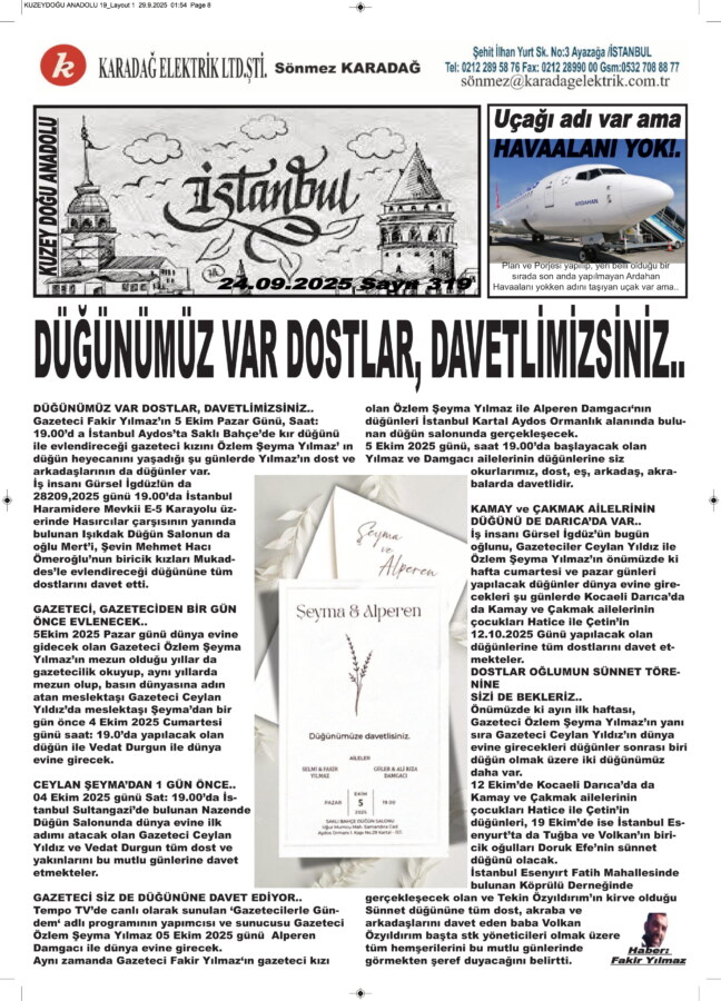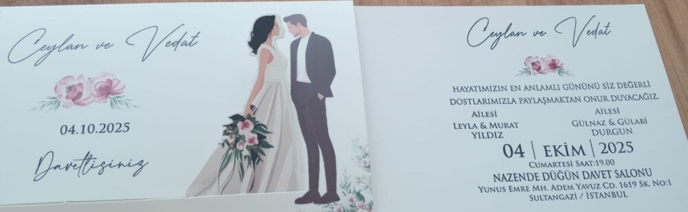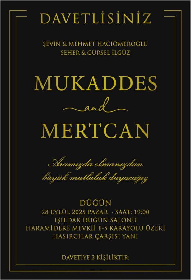 04 Ekim 2025 günü Sat: 19.00’da İstanbul Sultangazi’de bulunan Nazende Düğün Salonunda dünya evine ilk adımı atacak olan Gazeteci Ceylan Yıldız ve Vedat Durgun tüm dost ve yakınlarını bu mutlu günlerine davet etmekteler.