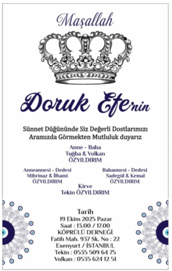 İstanbul Esenyırt Fatih Mahallesinde bulunan Köprülü Derneğinde gerçekleşecek olan ve Tekin Özyıldırım’ın kirve olduğu Sünnet düğününe tüm dost, akraba ve arkadaşlarını davet eden baba Volkan Özyıldırım başta stk yöneticileri olmak üzere tüm hemşerilerini bu mutlu günlerinde görmekten şeref duyacağını belirtti.
