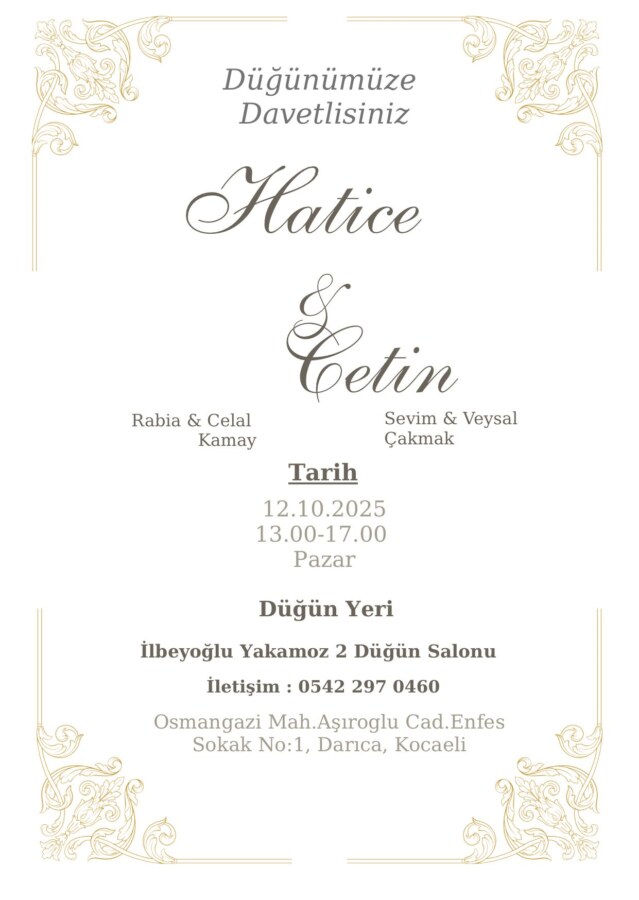 İş insanı Gürsel İgdüz’ün bugün oğlunu, Gazeteciler Ceylan Yıldız ile Özlem Şeyma Yılmaz’ın önümüzde ki hafta cumartesi ve pazar günleri yapılacak düğünler dünya evine girecekleri şu günlerde Kocaeli Darıca’da da Kamay ve Çakmak ailelerinin çocukları Hatice ile Çetin’in 12.10.2025 Günü yapılacak olan düğünlerine tüm dostlarını davet etmekteler.