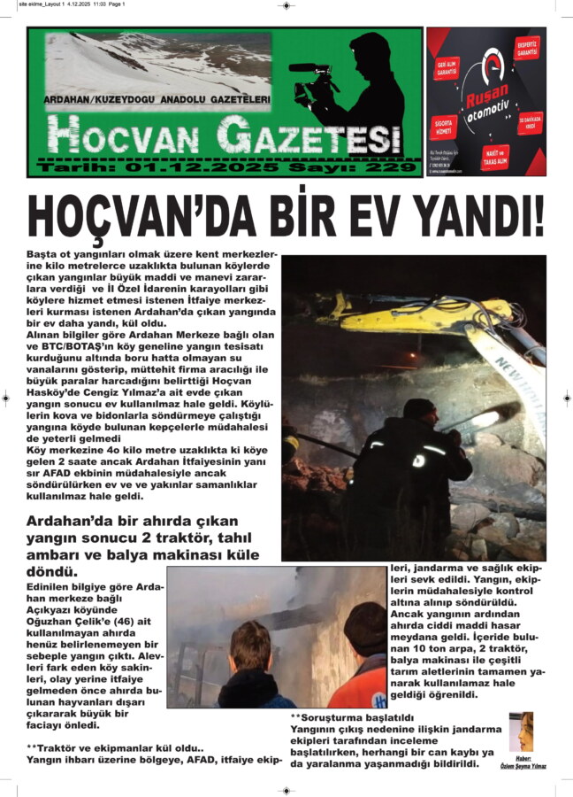 Alınan bilgiler göre Ardahan Merkeze bağlı olan ve BTC/BOTAŞ‘ın köy geneline yangın tesisatı kurduğunu altında boru hatta olmayan su vanalarını gösterip, müttehit firma aracılığı ile büyük paralar harcadığını belirttiği Hoçvan Hasköy‘de Cengiz Yılmaz’a ait evde çıkan yangın sonucu ev kullanılmaz hale geldi. Köylülerin kova ve bidonlarla söndürmeye çalıştığı yangına köyde bulunan kepçelerle müdahalesi de yeterli gelmedi