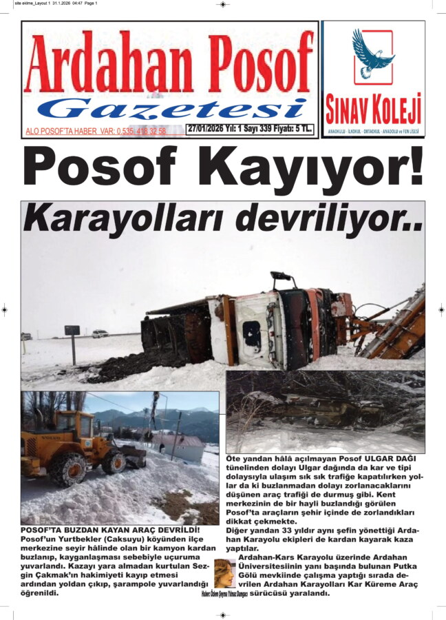 Posof’un Yurtbekler (Caksuyu) köyünden ilçe merkezine seyir hâlinde olan bir kamyon kardan buzlanıp, kayganlaşması sebebiyle uçuruma yuvarlandı. Kazayı yara almadan kurtulan Sezgin Çakmak’ın hakimiyeti kayıp etmesi ardından yoldan çıkıp, şarampole yuvarlandığı öğrenildi.