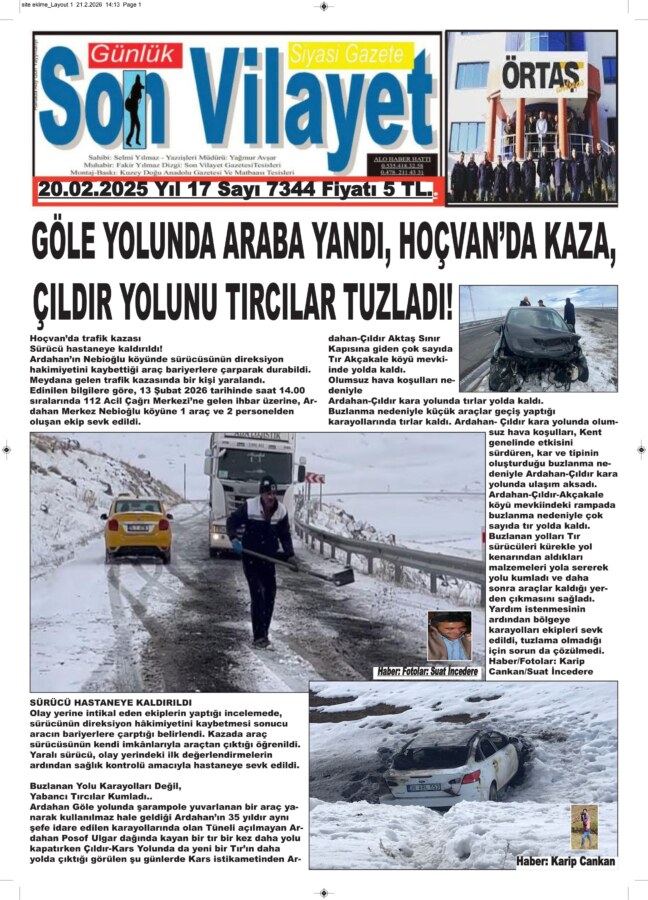 Buzlanma nedeniyle küçük araçlar geçiş yaptığı karayollarında tırlar kaldı. Ardahan- Çıldır kara yolunda olumsuz hava koşulları, Kent genelinde etkisini sürdüren, kar ve tipinin oluşturduğu buzlanma nedeniyle Ardahan-Çıldır kara yolunda ulaşım aksadı.