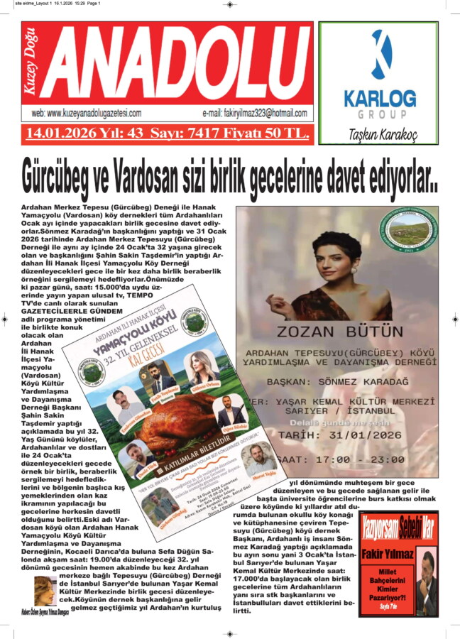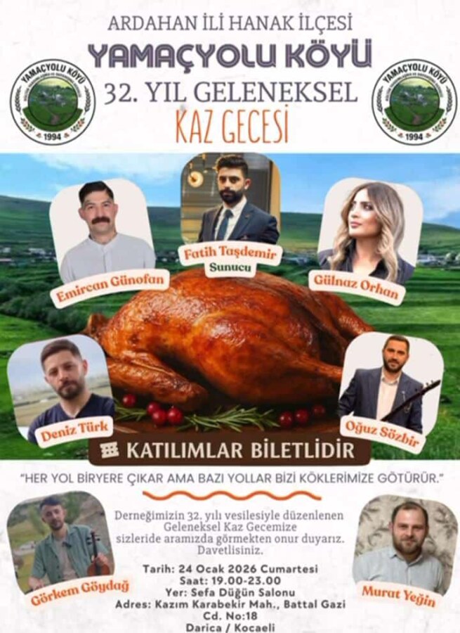 Önümüzde ki pazar günü, saat: 15.000’da uydu üzerinde yayın yapan ulusal tv, TEMPO TV’de canlı olarak sunulan GAZETECİLEERLE GÜNDEM adlı programa yönetimi ile birlikte konuk olacak olan Ardahan İli Hanak İlçesi Yamaçyolu (Vardosan) Köyü Kültür Yardımlaşma ve Dayanışma Derneği Başkanı Şahin Sakin Taşdemir yaptığı açıklamada bu yıl 32. Yaş Gününü köylüler, Ardahanlılar ve dostları ile 24 Ocak’ta düzenleyecekleri gecede örnek bir birlik, beraberlik sergilemeyi hedeflediklerini ve bölgenin başlıca kış yemeklerinden olan kaz ikramının yapılacağı bu gecelerine herkesin davetli olduğunu belirtti.