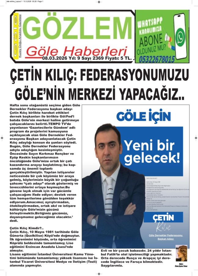 TEMPO TV’de yayınlanan ‘Gazetecilerle Gündem’ adlı program da projelerini kamuoyuna açıklayacak olan Göle Dernekler Federasyonu Başkan adayı anlatacak Çetin Kılıç adaylığı konsun da şunları söyledi.