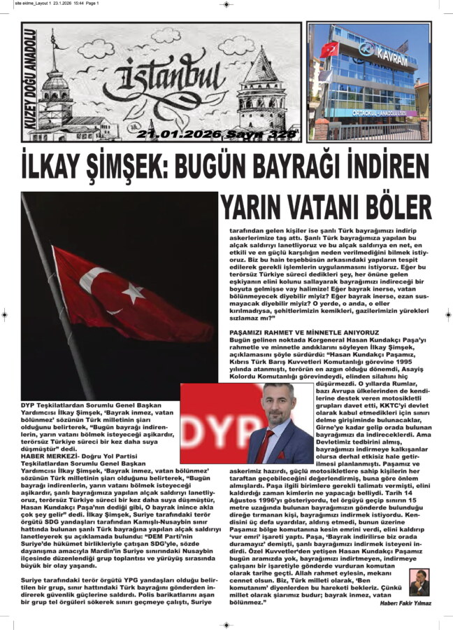 HABER MERKEZİ- Doğru Yol Partisi Teşkilatlardan Sorumlu Genel Başkan Yardımcısı İlkay Şimşek, ‘Bayrak inmez, vatan bölünmez’ sözünün Türk milletinin şiarı olduğunu belirterek, “Bugün bayrağı indirenlerin, yarın vatanı bölmek isteyeceği aşikardır, şanlı bayrağımıza yapılan alçak saldırıyı lanetliyoruz, terörsüz Türkiye süreci bir kez daha suya düşmüştür, Hasan Kundakçı Paşa’nın dediği gibi, O bayrak inince akla çok şey gelir” dedi. İlkay Şimşek, Suriye tarafındaki terör örgütü SDG yandaşları tarafından Kamışlı-Nusaybin sınır hattında bulunan şanlı Türk bayrağına yapılan alçak saldırıyı lanetleyerek şu açıklamada bulundu: “DEM Parti’nin Suriye’de hükümet birlikleriyle çatışan SDG’yle, sözde dayanışma amacıyla Mardin’in Suriye sınırındaki Nusaybin ilçesinde düzenlendiği grup toplantısı ve yürüyüş sırasında büyük bir olay yaşandı.