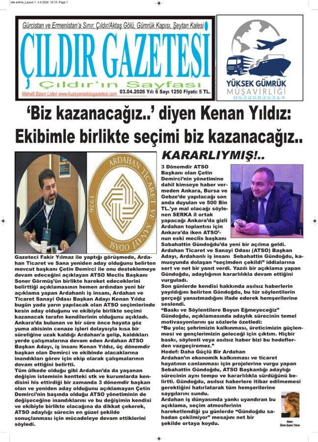 Gazeteci Fakir Yılmaz ile yaptığı görüşmede, Ardahan Ticaret ve Sana yeniden aday olduğunu belirten mevcut başkanı Çetin Demirci ile onu desteklemeye devam edeceğini açıklayan ATSO Meclis Başkanı Soner Görmüş’ün birlikte hareket edeceklerini belirttiği açıklamasının hemen ardından yeni bir açıklama yapan Ardahanlı iş insanı , Ardahan ve Ticaret Sanayi Odası Başkan Adayı Kenan Yıldız bugün yada yarın yapılacak olan ATSO seçimlerinde kesin aday olduğunu ve ekibiyle birlikte seçimi kazanacak tarafın kendilerinin olduğunu açıkladı.