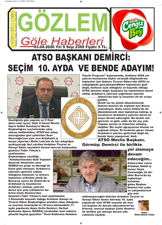 3 Dönemdir başında olduğu Ardahan Sanayi ve Ticaret Odası Başkanlığına yeniden aday olduğunu ve seçimin önümüzde ki 10’uncu bilemediniz 11 ayda yapılacak diyen Çetin Demirci , Serhat Kalkınma Ajansı (SERKA) tarafından özel sektöre yönelik hayata geçirilen “Yerel Kalkınma Hamlesi Teşvik Programı” kapsamında, Ardahan 2026 yılı yatırım konularına ilişkin stratejik bilgilendirme toplantısı için Ankara Ticaret Odası’nda (ATO) ev sahipliğinde gerçekleştirdikleri toplantının gizli değil, herkese açık olduğunu ve başında olduğu ATSO yönetim değil, başkanın bu toplantılara davet edilip, Ardahan’a yatırıma çağrılması üzerine Ankara’da bazı iş insanları ile bir araya geldim. Şimdi ise bu yönde düzenlenecek Ankara benzeri bir toplantı için Bursa yolundayım. Daha sonra Gebze’de de düzenlenecek olan toplantıya katılıp, iş insanlarını Ardahan’a yatırma davet etmeye devam edeceğim. Bu benim aslı görevim ve gizli, saklı da bir şey yok. Yapılan yorum ve haberleri anlamış değilim. Biz neyle uğraşıyoruz bazılar ne yapmak istiyor. Ki herkesin görev istemi Ardahan’a yarımcı getirmek değil mi, bende bunu yapıyorum’ dedi.