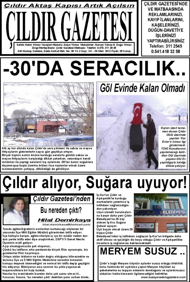 Ve diyor ki; ‘Ne o gazeteci eskisi gibi köyleri gezmiyor, kentin, ilçelerin, köylerin göz ardı edilen sorunlarını sende görmüyorsun. Bak gel hele o birilerinin her gün gelip geçtiği Çıldır’ın Meryem köyünün suyu aylardır akmıyor. Yeni kurduğun gazetenin bulunduğu Hanak’a giderken yol üstünde bulunan ve Ardahan eski milletvekillerinden Faruk Demir’in de köyü olan Çayağzı köylüleri de susuz.. Hoçvan/Kımılı köyü yani Otbiçen’in öğretmeni doğru dürüst okula gitmiyor, Bu köyün asıl öğretmeni başka köye alındı. Göle’nin köyleri gibi kent merkezinin yanı sıra arka sokaklarında da kar ve buzdan geçilemiyor. Hanak, Damal, Çıldır ve Posof’ta da durum aynı.. Sen ve senin gibi orada gazetecilik yapan arkadaşlar bunları niye dile getirmiyorlar. Ne oldu sizlere?’