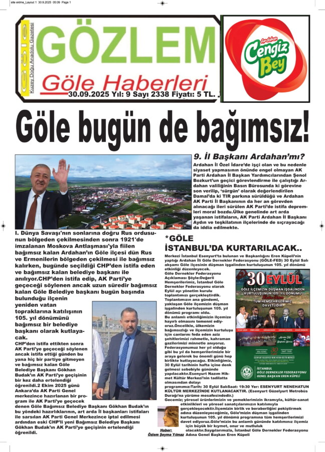 2 Ekim 2025 günü Ankara’da AK Parti Genel merkezince hazırlanan bir program ile AK Parti’ye geçecek denen Göle Bağımsız Belediye Başkanı Gökhan Budak’ın bu yöndeki hazırlıklarının, art arda İl başkanları istifaları ile sarsılan AK Parti Genel Merkezince iptal edilmesi ardından eski CHP’li yeni Bağımsız Belediye Başkanı Gökhan Budak’ın AK Parti’ye geçişinin ertelendiği öğrenildi.