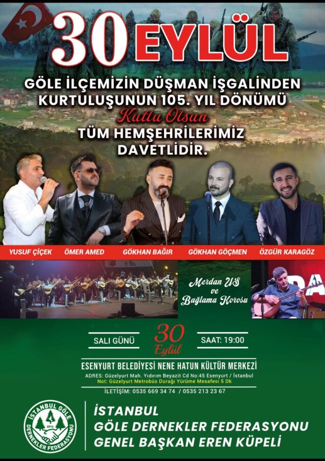 Merkezi İstanbul Esenyurt’ta bulunan ve Başkanlığını Eren Küpeli’nin yaptığı Ardahan İli Göle Dernekler Federasyonu (GÖLE-FED) 30 Eylül Salı akşamı Göle ilçesinin düşman işgalinden kurtuluşunun 105. yıl dönümü etkinliği düzenleyecek.