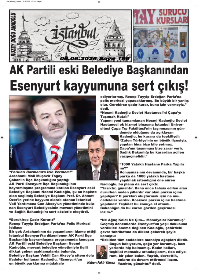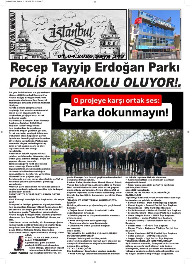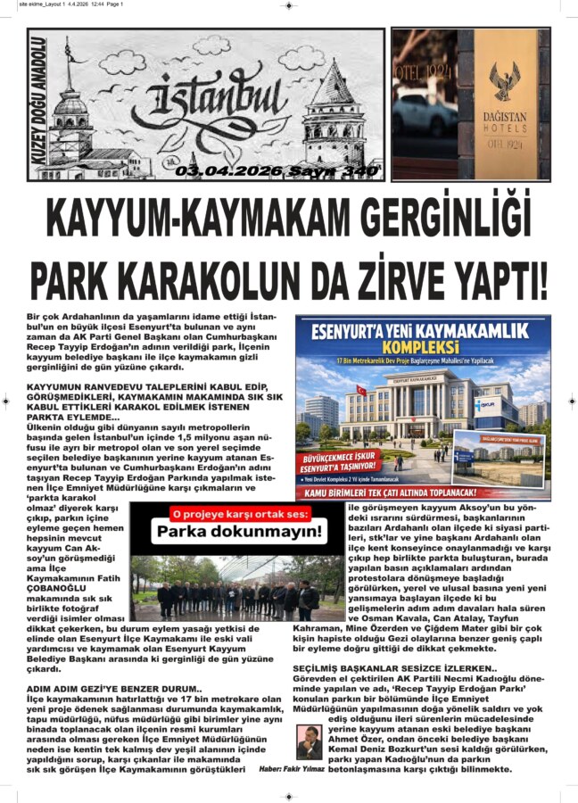 Ülkenin olduğu gibi dünyanın sayılı metropollerin başında gelen İstanbul’un içinde 1,5 milyonu aşan nüfusu ile ayrı bir metropol olan ve son yerel seçimde seçilen belediye başkanının yerine kayyum atanan Esenyurt’ta bulunan ve Cumhurbaşkanı Erdoğan’ın adını taşıyan Recep Tayyip Erdoğan Parkında yapılmak istenen İlçe Emniyet Müdürlüğüne karşı çıkmaların ve ‘parkta karakol olmaz’ diyerek karşı çıkıp, parkın içine eyleme geçen hemen hepsinin mevcut kayyum Can Aksoy’un görüşmediği ama İlçe Kaymakamının Fatih Çobanoğlu makamında sık sık birlikte fotoğraf verdiği isimler olması dikkat çekerken, bu durum eylem yasağı yetkisi de elinde olan ve AK Parti İlçe Başkanı da Ardahanlı olan İstanbul Esenyurt İlçe Kaymakamı ile eski vali yardımcısı ve kaymamak olan Esenyurt Kayyum Belediye Başkanı arasında ki gerginliği de gün yüzüne çıkardı.
