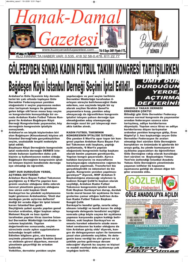 Ardahan’ın Göle İlçesinin köy derneklerini bir çatı altında toplayan Göle Dernekler Federasyonun yeniden olağanüstü ir seçim yapmasına neden olan tartışmalı kongre ile gündeme gelen bölge stk’larun masa başı seçim ve kongrelerinin konuşulduğu bir esnada Ardahan Kadın Futbol Takımı Kongresi ile Ardahan Bağdeşen Köyü Derneği Kongrelerinde yaşananlar, köy derneğinin kongresinin iptaliyle sonuçlandı.