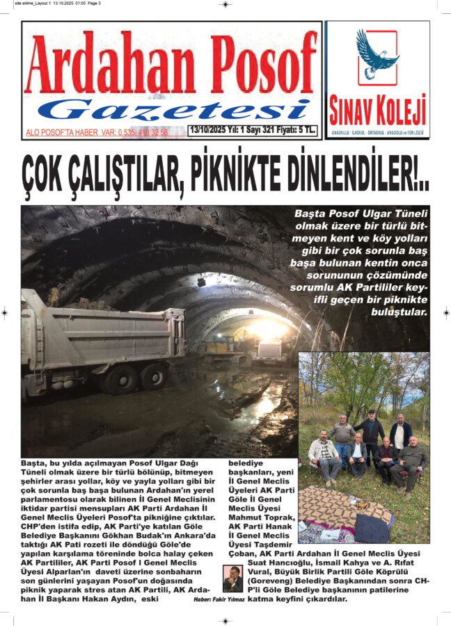 Başta, bu yılda açılmayan Posof Ulgar Dağı Tüneli olmak üzere bir türlü bölünüp, bitmeyen şehirler arası yollar, köy ve yayla yolları gibi bir çok sorunla baş başa bulunan Ardahan’ın yerel parlamentosu olarak bilinen İl Genel Meclisinin iktidar partisi mensupları AK Parti Ardahan İl Genel meclis Üyeleri Posof’ta pikniğine çıktılar.
