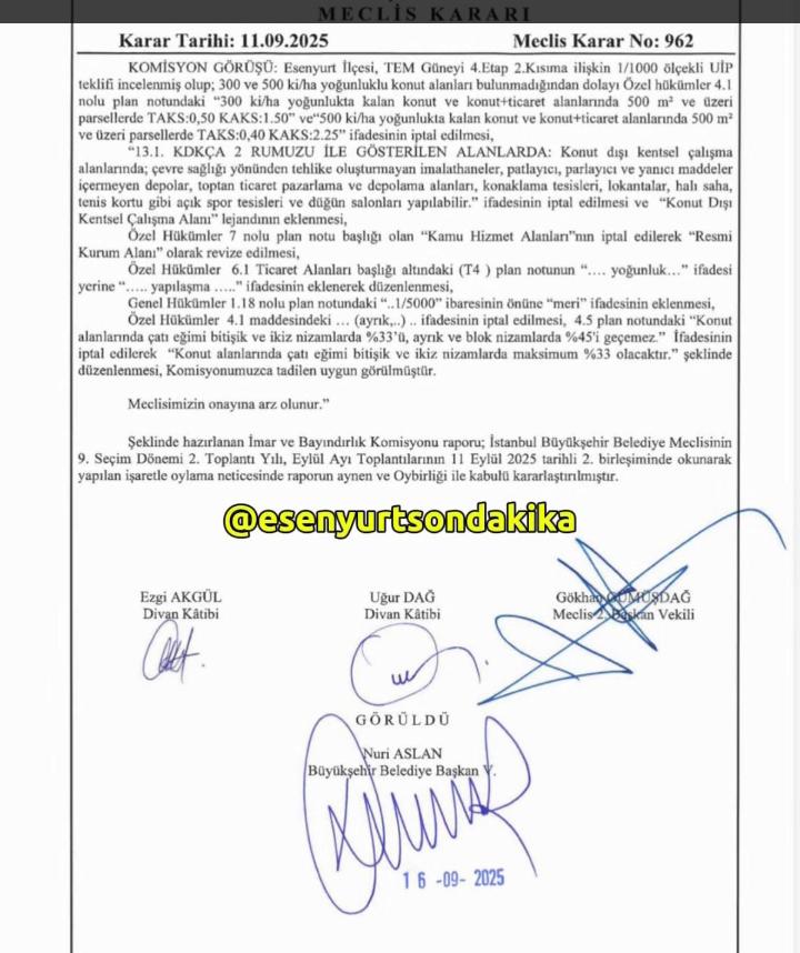 Esenyurt Emniyet Müdürlüğü parka yapılmaz..’ diyen Kent Konseyinin başkanının meclis üyesi oğlu ‘yapılsın’ demiş.. Başta Ardahanlı Tuncer Dağ’ın başkanlığını yaptığı Esenyurt Kent Konseyi olmak üzere CHP ile bazı siyasi partilerin ilçe temsilcilerinin Recep Tayyip Erdoğan Parkına yapılması planlanan Emniyet Müdürlüğünün iptali için imza kampanyası başlatırken Esenyurt Kent Konseyi Başkanı Tuncer Dağ’ında aralarında olduğu İBB meclisinde 11.09.2025 alınan kararda AK Parti ve CHP’nin oylarıyla o bölgeye karakol yapımı onaylandığı ortaya çıktı. İBB Başkanvekili Nuri Aslan imzalı işte o belge.