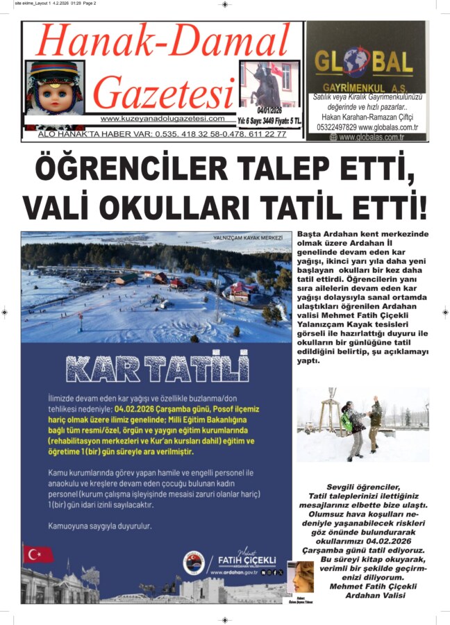 Başta Ardahan kent merkezinde olmak üzere Ardahan İl genelinde devam eden kar yağışı, ikinci yarı yıla daha yeni başlayan okulları bir kez daha tatil ettirdi. Öğrencilerin yanı sıra ailelerin devam eden kar yağışı dolaysıyla sanal ortamda ulaştıkları öğrenilen Ardahan valisi Mehmet Fatih Çiçekli Yalanızçam Kayak tesisleri görseli ile hazırlattığı duyuru ile okulların bir günlüğüne tatil edildiğini belirtip, şu açıklamayı yaptı.