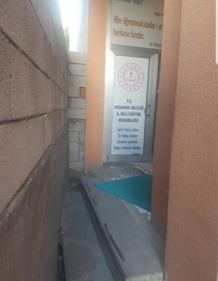 15 Temmuz Darbe Girişimi ardından el konulan binalardan bir olan bir binaya taşınan anacak yan komşu ile yaşadığı arsa davası dolaysıyla dar bir alanda ancak girilen Ardahan İl Milli Eğitim Müdürlüğü kapısı kentteki eğitimi durumlunu anlatır durum da.