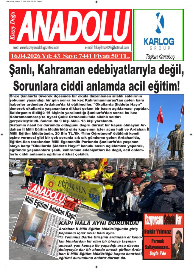 Başta şu günlerde çamur deryasına dönen Ardahan’ın yollarından kapatılan köy okullarında ki öğlencileri şehirler de kapıları doğru dürüst kapısı olmayan müdürlüğe bağlı olan okullarına getirmeye çalışılan sistemin nasıl bir durumda olduğunu doğru dürüst bir kapısı olmayan Ardahan İl Milli Eğitim Müdürlüğü giriş kapısının içler acısı hali ve Ardahan İl Milli Eğitim Müdürünün, 20 Bin TL.’ilk ‘Yılın Öğretmeni’ ödülünü kendi eşine vermesi gibi bir çok sorunla sık sık gündeme gelen Ardahan’da, Eğitim-Sen tarafından Milli Egemenlik Parkında Şanlıurfa’da yaşanan olaya karşı “Okullarda Şiddete Hayır” konulu basın açıklaması yaparak, eğitimde yaşananlara şanlı, kahraman edebiyatları ile değil, acil önlemlerle ciddi anlamda eğitime dikkat çekildi.